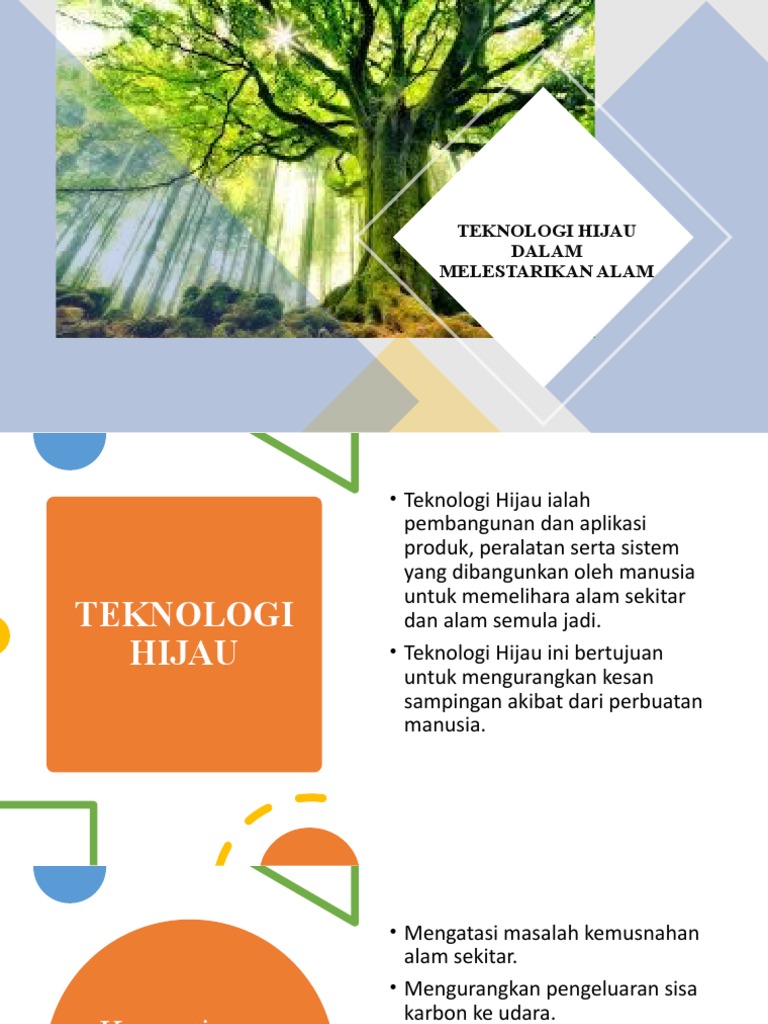 Teknologi terus berkembang namun kita tidak boleh mengabaikan kebergantungan kita ke atas alam sekitar. Selain itu teknologi hijau memastikan pembangunan mapan dan memulihara alam sekitar untuk generasi akan datang serta meningkatkan pendidikan dan kesedaran awam terhadap teknologi hijau dan meluas teknologi hijau. Pelepasan karbon yang rendah membantu pengurangan pemanasan global dan penipisan ozon, yang menjadi instrumen kepada pengekalan kelestarian ekosistem kehidupan manusia. Teknologi hijau bukan lagi perkara baharu di malaysia, namun, tahap kesedaran dan pengetahuan rakyat malaysia tentang kepentingan. Aug 05, 2017 · • aktiviti pertanian yang dijalankan telah menjejaskan alam sekitar.namun amalan teknologi hijau dalam pertanian dapat melestarikan alam ini.